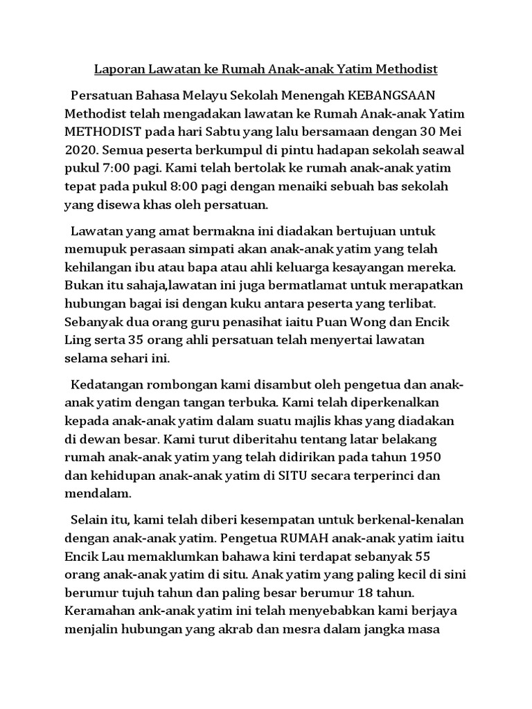 Persatuan Bahasa Melayu Sekolah Menengah KEBANGSAAN Methodist telah mengadakan lawatan ke Rumah Anak-anak Yatim METHODIST pada hari Sabtu yang lalu bersamaan dengan 30 Mei 2020. Berikut adalah contoh kertas kerja dari pelajar uniten. Contoh Laporan Lawatan Ke Rumah Anak Yatim Pdf.